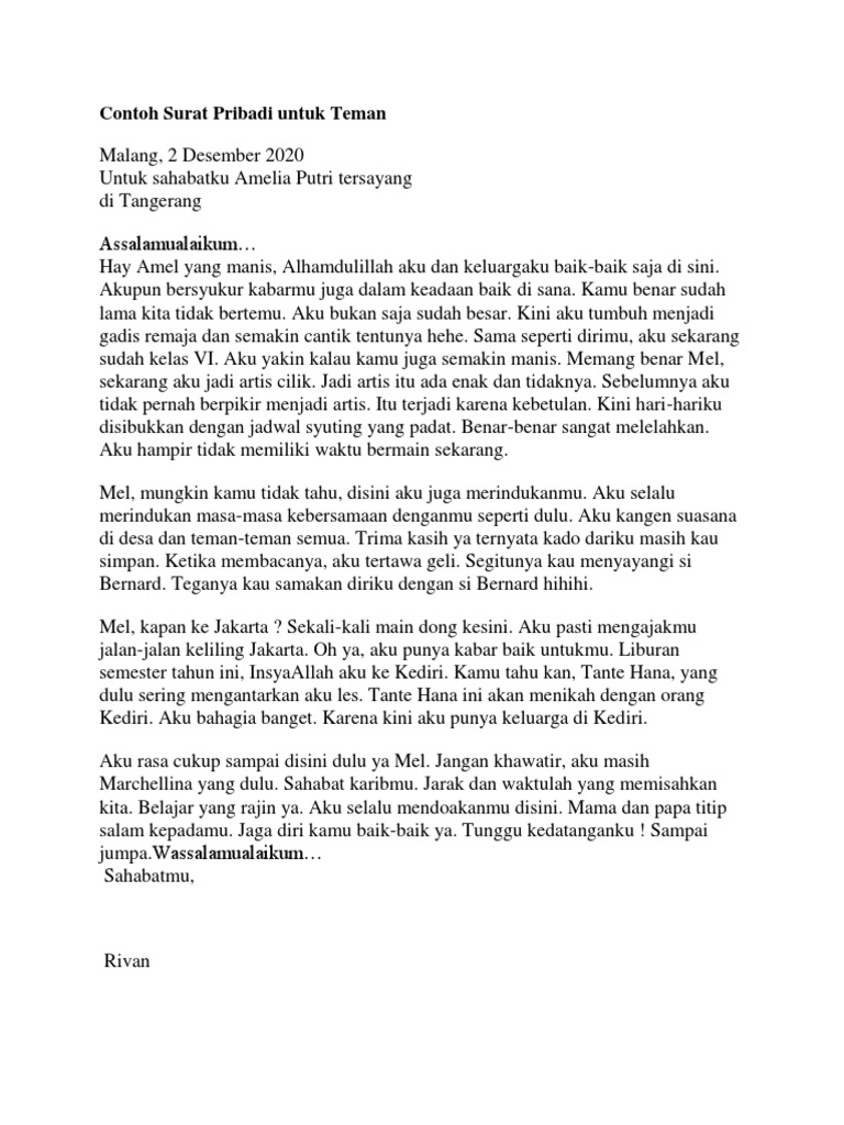 Contoh surat pribadi zaman dahulu surat digunakan untuk memberikan kabar baik itu kepada teman keluarga sanak saudara dan lain sebagainya. Jika dulu semua orang mengirimkan kabar atau pesan melalui sebuah surat pribadi maka sekarang ini mereka bisa dengan mudah bertukar kabar dan menjalin komunikasi melalui media elektronik seperti video call pesan singkat bahkan chatting. Contoh surat pribadi seiring perkembangan zaman dan kecanggihan teknologi sekarang ini proses berkirim surat kepada teman sahabat keluarga dan guru sudah jarang sekali dilakukan oleh setiap orang. Contoh surat pribadiadalah surat yang digunakan untuk menyampaikan beritainformasi yang dibuatdikirim oleh seseorang sebagai pribadipada umumnya surat pribadibersifat personaltidak resmi bebas menggunakan bahasa sehari hari dan berisi masalah masalah pribadi. Atau jika anda memiliki kenalan bule dan ingin berkirim surat dengannya. Untuk lebih mendalaminya sebaiknya kamu memahami terlebih dahulu unsur unsur surat pribadi.