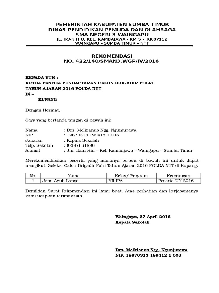 Contoh surat rekomendasi sekolah untuk siswa. 15 contoh surat rekomendasi yang baik dan paling lengkap jika diartikan secara sederhana maka surat rekomendasi bisa diartikan sebagai surat yang dibuat oleh seorang pimpinan atau pejabat tertentu yang berisi keterangan tentang seseorang berdasarkan fakta fakta yang ada. Tidak heran jika pemerintah indonesia baik dari pemerintah pusat sampai pemerintah daerah seringkali menyediakan beasiswa kepada para siswamahasiswa yang layak menerimanya begitu juga dengan pihak pihak lain. Contoh surat surat rekomendasi oleh kepala sekolah untuk siswa mengikuti lomba cabang olahraga berikut ini adalah contoh tentang contoh surat surat rekomendasi oleh kepala sekolah untuk siswa mengikuti lomba cabang olahraga seperti surat contoh yang tertulis di bawah ini. Surat rekomendasi adalah sebuah surat yang berisi suatu rujukan rekomendasi kepada orang yang dituju dalam surat dari institusi pengirim atau pengirim perorangan yang berisi mengenai nilai tambah dalam tentang sesuatu hal atau keterangan tentang keadaan pribadi seseorang berdasarkan data data autentik yang ada karena diminta sendiri oleh pihak yang bersangkutan untuk kepentingan pribadinya. Adapun surat rekomendasi sekolah biasanya diberikan kepada guru ataupun siswa demi kepentingan guru atau siswa tersebut. Surat izin ini dibuat untuk mendapatkan persetujuan dari pihak kepala sekolah atau madrasah bahwa tim yang akan dikirim atau siswa yang ikut lomba merupakan resmi dari sekolah dan atas.