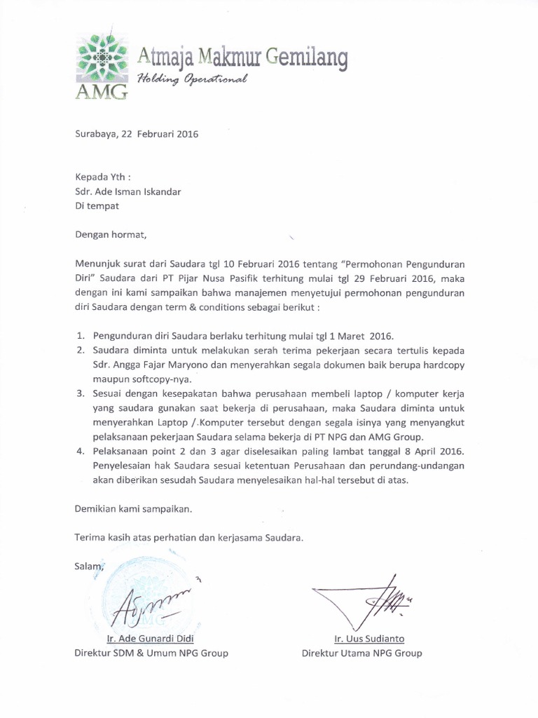 Satu hal yang paling ditakuti oleh seorang karyawan pasti pemutusan kerja dari pimpinan perusahaan namun adakalanya seorang karyawan yang sangat disenangi oleh pimpinannya malah. Rajawali timur no 17 bandung jawa barat. Contoh surat pengunduran diri resmi. Download contoh surat pengunduran diri pegawai honorer doc. Terkadang ada banyak hal disaat kita bekerja di sebuah perusahaan atau instansi yang membuat kita merasa tidak nyaman bekerja lagi. Adil sentosa di jln.