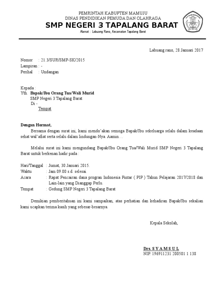 Atau bisa juga berupa surat undangan rapat membahas admisnistrasi sekolah smk tahun 20182019. Format surat tentunya memuat kop sekolah madrasah kepala surat isi surat serta penutup serta harus diketik dengan rapi dan jelas khususnya waktu tanggal tempat dan kegiatan agar surat undangan tersebut efektif tentunya juga harus bubuhi. Contoh surat undangan orang tua wali muridsurat merupakan dokumen penting yang harus diarsipkan oleh setiap sekolah. Salah satu surat resmi yang sering dibuat oleh pihak sekolah adalah surat undangan orang tua atau wali siswa diantaranya untuk menghadapi kenaikan kelas sekaligus pembagian raport atau untuk menghadapi salah satu acara yang diadakan oleh pihak sekolah dengan orang tua atau. Surat yang saya bagikan ini dikhususnya untuk surat undangan rapat wali murid kelas 6 9. Contoh surat undangan rapat waliorang tua murid tk surat undangan adalah sebuah surat yang dikirim kepada seseorang agar orang yang dimaksud datang pada waktu tempat acara yang telah ditentukan.