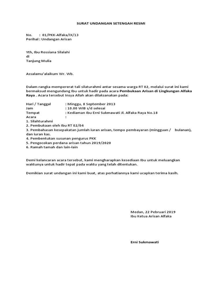 Contoh surat undangan setengah resmi. Tandai dengan warna biru untuk contoh undangan tidak resmi. Kita tahu bahwa surat undangan adalah artikel di surat kabar yang memuat undangan kepada orang lain untuk menghadiri. Tandai dengan warna kuning untuk contoh undangan setengah resmi. Surat undangan yang resmi merupakan sebuah surat yang dikeluarkan oleh lembaga perusahaan atau instansi tertentu untuk ditujukan kepada pihak pihak yang bersangkutan dengan tujuan untuk dapat menghadiri acara yang diselenggarakan. Contoh surat undangan kita tahu surat undangan adalah sebuah tulisan di dalam kertas yang memuat ajakan kepada orang lain baik perorangan maupun kelompok untuk menghadiri kegiatan tertentu. Keduanya memiliki karakteristik yang berbeda dan digunakan untuk keperluan yang tidak sama.