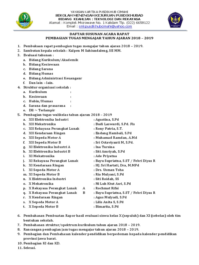 Beberapa penyebabnya seperti waktu pelaksana rapat yang tidak sesuai undangan atau kegiatan rapat. Jadi agenda tersebut berisi susunan acara rapat yang disusun berurutan yang dibatasi dengan waktu serta petugas yang bersangkutan untuk mengisi acara tersebut. Itu tadi contoh susunan acara rapat kerja mulai dari pembukaan sambutan sampai dengan acara penutupan rapat kerja. Contoh susunan acara rapat pertanggung jawaban terkadang kegiatan rapat memang tidak perlu susunan acara namun berbeda halnya jika rapat ini dihadiri oleh banyak orang untuk keperluan pembahasan lpj laporan pertanggung jawaban kegiatan. Pertama tama marilah kita panjatkan rasa puja dan puji syukur kehadirat allah swt yang mana pada pagi hari ini kita semua dapat berkumpul bersama dalam acara rapat rutin persit kartika chandra kirana dalam keadaan sehal walafiat. Entah itu organisasi kesiswaan kemahasiswaan ataupun organisasi perusahaan.