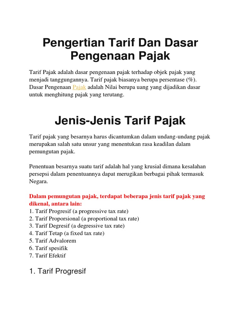 Pengertian tarif sering kali diartikan sebagai daftar harga sewa ongkos dan sebagainya sehingga dari pengertian tersebut sanggup disimpulkan bahwa tarif sama dengan harga. Tarif pajak degresif degresif yang dimaksud dengan tarif pajak degresif degresif adalah tarif pajak yang persentasenya semakin kecil jika dasar pengenaan pajaknya meningkat dan besarnya penurunan tarif semakin kecil. Contoh tarif pajak tetap adalah bea meterai yang berapapun nominalnya akan dikenakan tarif tetap yaitu rp6000. Secara struktural menurut tarif pajak dibagi dalam empat jenis yaitu. Contohnya saja seperti bea cukai. Contoh teks laporan hasil observasi.