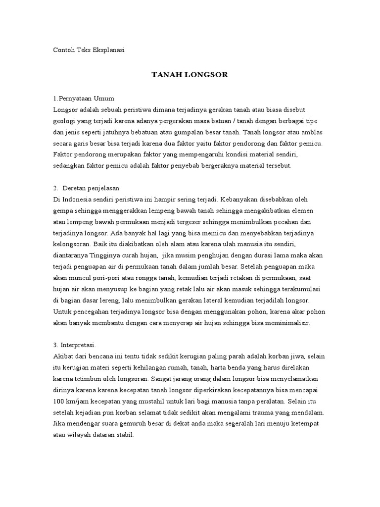 Tanah longsor juga bisa dikatakan sebagai fenomena amblasnya tanah atau bebatuan dari suatu ketinggian. Contoh explanation text tentang tanah longsor bencana tanah longsor sering terjadi di beberapa wilayah di indonesia khususnya di daerah pegunungan. Contoh teks eksplanasi tentang bencana alam tanah longsor longsor adalah sebuah peristiwa dimana terjadinya gerakan tanah atau biasa disebut geologi yang terjadi karena adanya pergerakan masa batuan atau tanah dengan berbagai tipe dan jenis seperti jatuhnya bebatuan atau gumpalan besar tanah. Longsor adalah suatu peristiwa geologi yang timbul karena pergerakan masa batuan atau tanah dengan berbagai tipe dan jenis seperti jatuhnya gumpalan tanah yang besar atau jatuhnya bebatuan. Contoh teks eksplanasi tanah longsor. Contoh teks eksplanasi tentang tanah longsor.