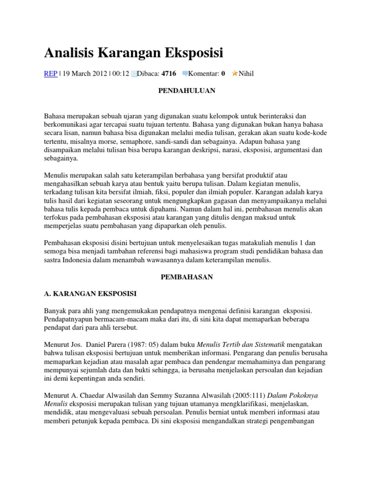 Contoh teks eksposisi teks eksposisi merupakan suatu tulisan yang berisi fakta atau informasi berbentuk pengembangan paragraf yang berupaya untuk menerangkan suatu keadaan tertentu sehingga orang yang membacanya mendapatkan pengetahuan dari apa yang diuraikan oleh penulis. Teks eksposisi merupakan sebuah pengembangan paragraf pada suatu penulisan yang dimana berisikan dengan tujuan dalam menjelaskan sebuah pengertian dengan gaya penulisan yang singkat padat serta akurat.