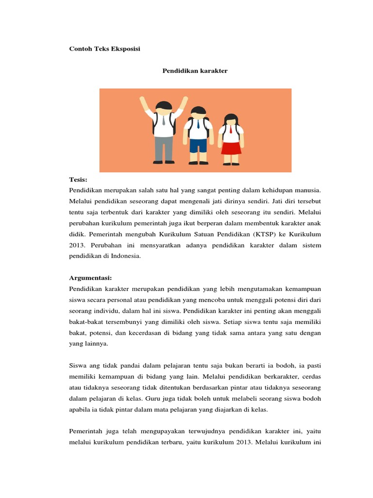 Contoh teks eksposisi pendidikan. Contoh teks eksposisi pendidikan umumnya sebuah teks eksposisi disusun secara ringkas dan padat berisi informasi serta pengetahuan. Teks eksposisi inipun berisikan sebuah informasi ataupun pengetahuan yang dimuat dengan cara singkat padat dan jelas. Sebenarnya apa itu pendidikan. Contoh teks eksposisi tentang pendidikan source. Pada dasarnya pendidikan adalah merupakan hak bagi setiap warga negara indonesia. Contoh teks eksposisi teks eksposisi merupakan suatu tulisan yang berisi fakta atau informasi berbentuk pengembangan paragraf yang berupaya untuk menerangkan suatu keadaan tertentu sehingga orang yang membacanya mendapatkan pengetahuan dari apa yang diuraikan oleh penulis.