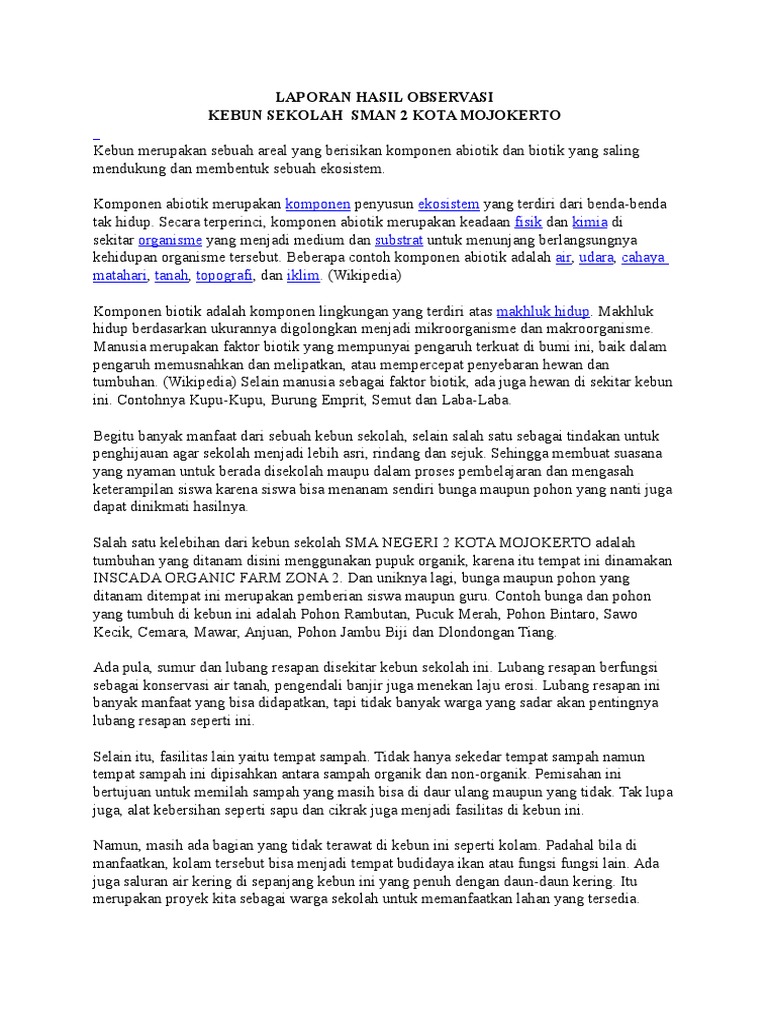 Contoh teks laporan hasil observasi tentang lingkungan hidup. Contoh teks laporan hasil observasi observasi dalam suatu penelitian yaitu salah satu teknik dalam pengumpulan data yang digunakan dalam suatu penelitian tertentu. Contoh teks laporan hasil observasi tahukah kalian observasi merupakan sebuah penelitian yang salah satu teknik dalam pengumpulan datanya digunakan dalam suatu penelitian tertentu. Ciri lainnya adalah informasi yang dimuat dalam teks laporan hasil observasi berdasarkan fakta. Sedangkan untuk teks hasil observasi memiliki pengertian yaitu isi teks yang menjelaskan tentang sesuatu informasi baik itu informasi tentang hewan tanaman fenomena alam hasil karya manusia dan fenomena sosial yang sesuai. Dosenpendidikancom observasi adalah salah satu teknik dalam teknik pengumpulan data yang digunakan dalam suatu penelitian tertentu. Definisi umum deskripsi bagian dan deskripsi manfaat.