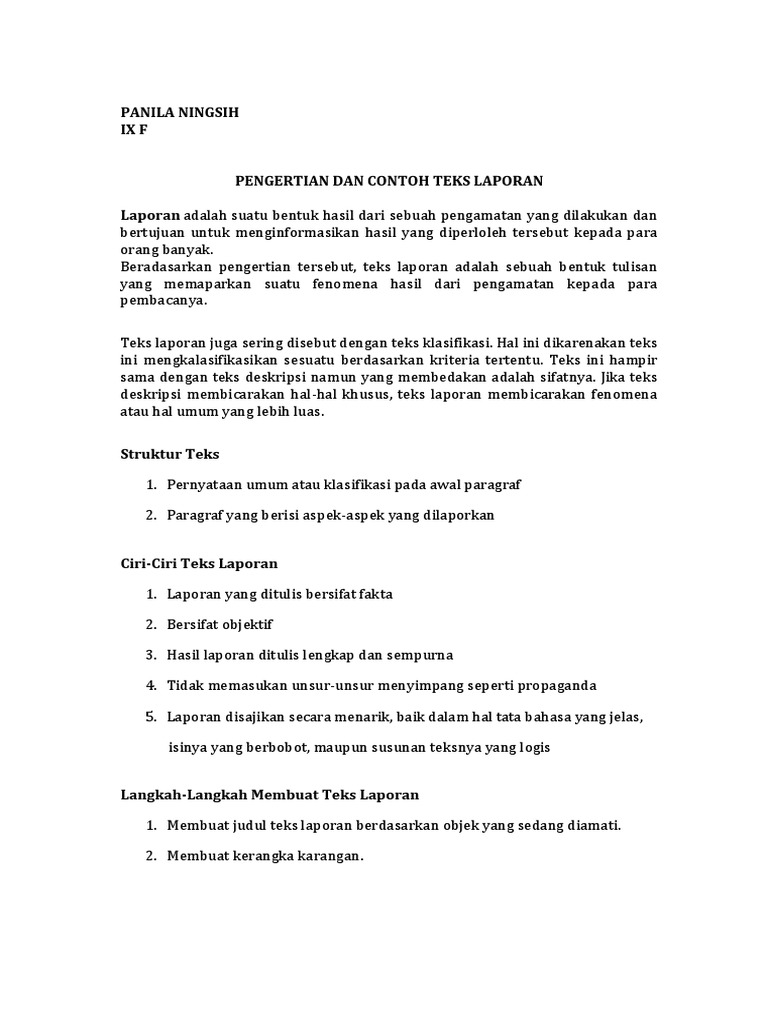 Teks laporan percobaan ialah teks yang isinya paparan mengenai tujuan proses dan hasil dari percobaan. Agar lebih memberikan gambaran secara menyeluruh maka berikut ini contoh pembuatan dalam teks laporan percobaan antara lain. Bagi kalian mahasiswa dan atau siswa yang sedang dan pernah melakukan praktikum tentu sangat erat hubunganya dengan istilah. Teks rekaman percobaan ialah sebuah teks atau tulisan yang bercerita tentang percobaan atau uji coba yang dilakukan oleh si penulis. Contoh teks laporan percobaan dan strukturnya. Menggunakan kata hubung selain menggunakan kata perintah teks laporan percobaan juga menggunakan kata hubung.