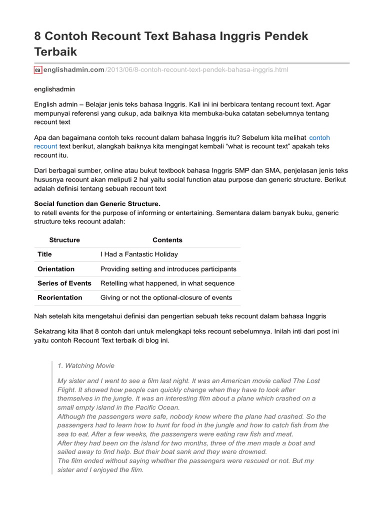 Contoh teks recount pendek beserta artinya. Contoh recount text recount text merupakan salah satu teks dalam materi bahasa inggris yang dibuat dengan tujuan menceritakan ulang berbagai kejadian dan peristiwa yang sudah terjadi di masa lalu. Dalam artikel ini akan diberikan contoh recountext pendek tentang liburan. 5 contoh recount text pendek beserta artinya tentang liburan contoh recount text singkat tentang liburan. Sebelum kita masuk ke pembahasan tentang kumpulan contoh recount text singkat tentang liburan ada baiknya kami mengulas sedikit mengenai pengertian recount text dan ciri khas nya yang membuat teks ini berbeda dengan jenis teks dalam bahasa. 10 contoh recount text holiday dan artinya terbaru halo sobat englishiana untuk belajar memahami kembali recount text yang telah kita bahas pada artikel yang berjudul recount text full materi contoh terbaru 2016 alangkah baiknya sobat baca contoh teks recount yang lain di bawah ini jika sobat masih bingung tentang bagaimana cara membuat recount text. Sebelum kita melihat contoh recount text berikut alangkah baiknya kita mengingat kembali what is recount text apakah teks recount itu.