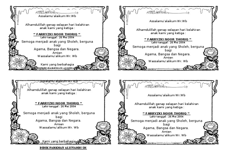 Tujuannya adalah untuk lebih mengirit kertas dan memudahkan dalam menentukan jumlah lembaran yang akan di print. Tujuan dari adanya kartu ucapan aqiqah tersebut adalah sebagai bentuk rasa syukur dan bahagia dari sang ayah dan ibu serta keluarga atas kelahiran buah hati dengan selamat dan sehat tanpa ada. Contoh kartu ucapan aqiqah berwarna versi ms word. Jaman sekarang siapa sih yang gak bisa mengoperasikan program tersebut. Layout menyesuaikan dengan contoh diatas yah. Ucapan nasi kotak aplikasi di google play.