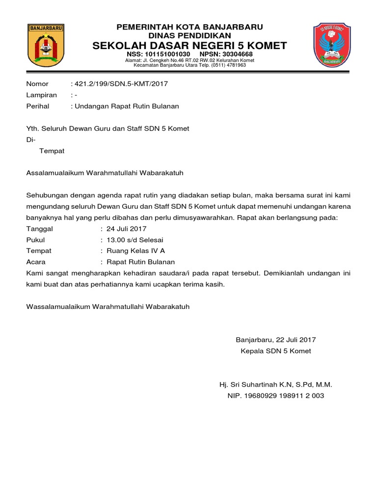 Karena ini biasanya digunakan oleh sebuah instansi pemerintahan maka harus ada kop surat nomor surat lampiran dan juga perihalkop surat memuat nama instansi pemerintahan alamat instansi dan juga nomor telepon fax ataupun email. Demikianlah contoh surat undangan untuk keperluan rapat di sekolah yang bisa admin berikan pada kali ini. Jika anda adalah seorang karyawan atau staf perusahaan mungkin tertarik melihat artikel lainnya silahkan baca di contoh surat bisniskembali ke topik bahasan pada artikel kali ini akan. Surat undangan dapat berupa surat resmi maupun tidak resmi. Rapat sendiri memiliki arti suatu kegiatan yang berisi diskusi guna membahas hal hal seperti merencanakan dan mengevaluasi sebuah kegiatan pada suatu tempat. Download contoh surat undangan rapat sekolah doc.