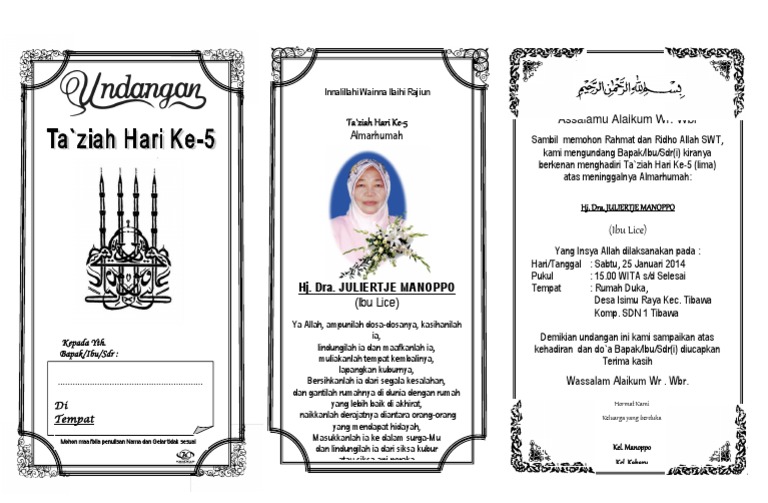 Adapun budaya tahlilan yang ada di jawa bukanlah hal wajib untuk di laksanakan oleh umat muslim mengingat rasullallah saw tidak pernah bersabda bahwa setelah. 7 21 40100 1000 hari. Gambar terkait contoh undangan takziah 7 hari. Contoh undangan tahlil tahlilan 7 hari40 hari100 hari dan1000 hari tahlil adalah salah satu tradisi yang sangat melekat pada komunitas muslim di indonesia. Contoh surat undangan tahlil digunakan untuk mengundang saudara tetangga sahabat dan kerabat untuk datang ke kediaman kita dalam acara tahlilanperlu diingat dalam pembuatan surat undangan harus lengkap supaya pihak yang diundang paham dan merasa penting untuk hadiri. Contoh undangan tahlil three hari kami berbagi contoh surat undangan demikian undangan ini kami sampaikan atas perhatian contoh undangan tahlilan 3 hari dan 7 hari kami berbagi contoh surat undangan tahlil forty 100 1000 hari setelah itu muslim di indonesia juga melaksanakan tahlilan pada hari ke forty one hundred dan one thousand harintoh undangan tahlilan forty hari meninggalnya.