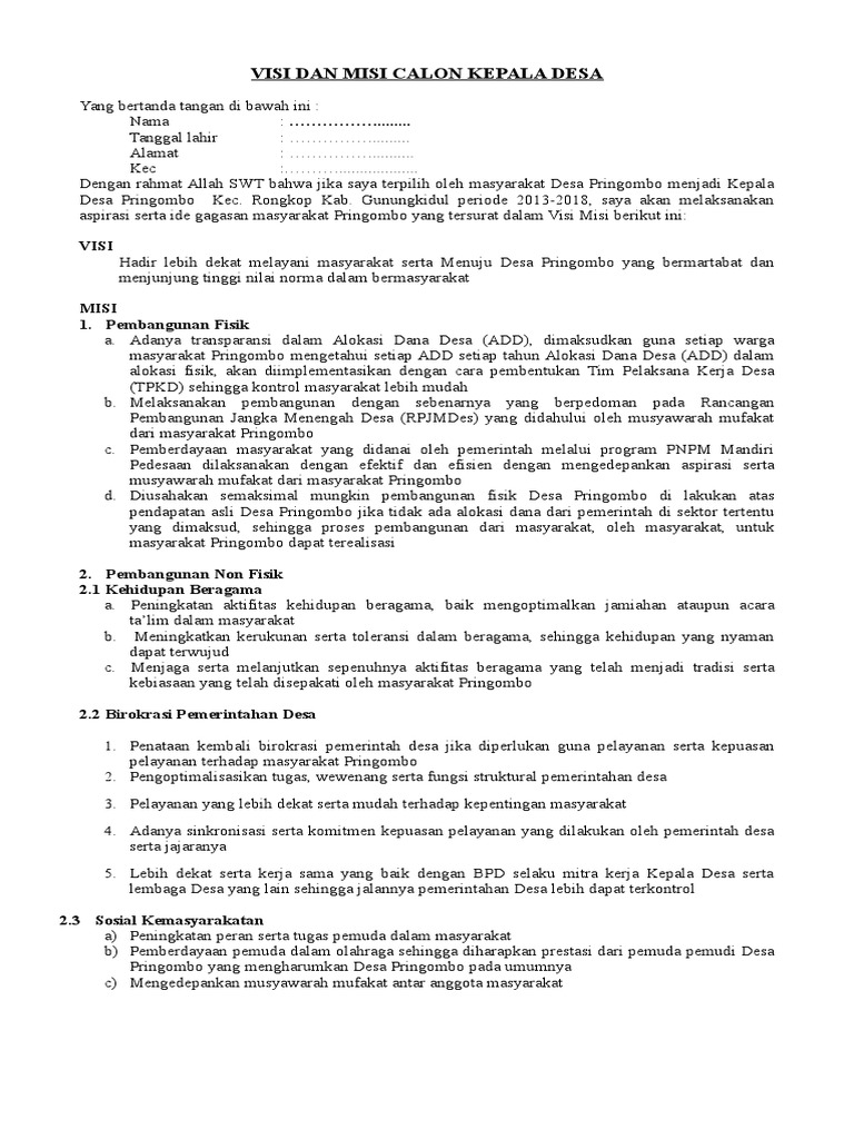Contoh visi dan misi kepala desa. Mengamalkan dan melaksanakan ajaran agama dalam kehidupan sehari hari. Contoh visi misi calon kepala desa kades lengkap bento. Contoh visi dan misi visi misi kepala desa terbaik dan terbaru. Tkh dan mhn ijin sbg referensi. Melakukan reformasi system kinerja aparatur pemerintahan desa guna meningkatkan kwalitas pelayanan kepada masyarakat. Academiaedu is a platform for academics to share research papers.