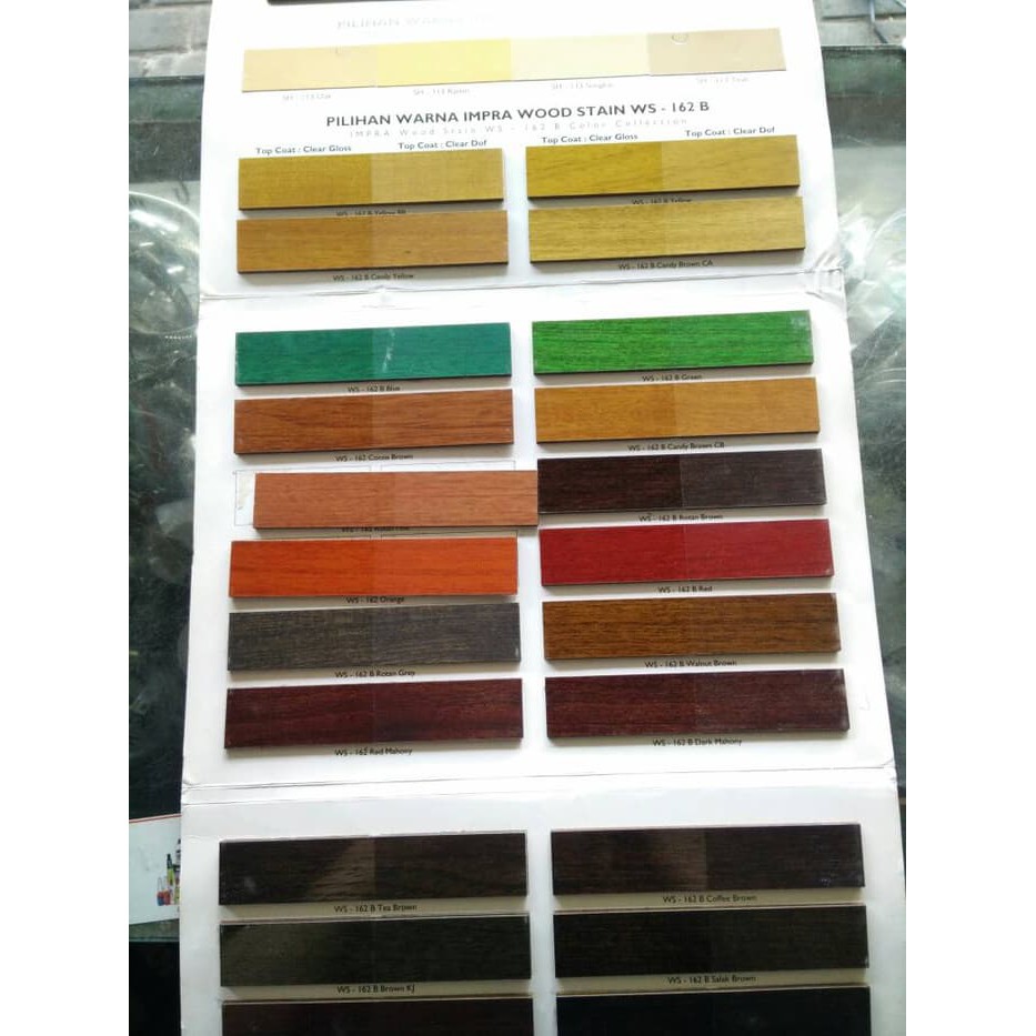 Katalog warna cat kayu dari produk cat kayu propan produsen cat dan pabrik cat indonesia. Sebagai catatan warna yag dihasilkan sangat tergantung dari substrat kayu mixing ratio dan cara aplikasi yang digunakan. Impra wood stain ws 162 b memiliki warna yang sangat jernih transparan mudah digunakan cepat kering dan mampu melakukan penetrasi dengan baik ke dalam kayu sehingga serat kayu benar benar lebih hidup. Biovarnish wood stain tersedia dalam beberapa varian warna populer wood stain. Kemudian amplas kambang menggunakan amplas nomor 400. Kemudian amplas kambang menggunakan amplas nomor 400.