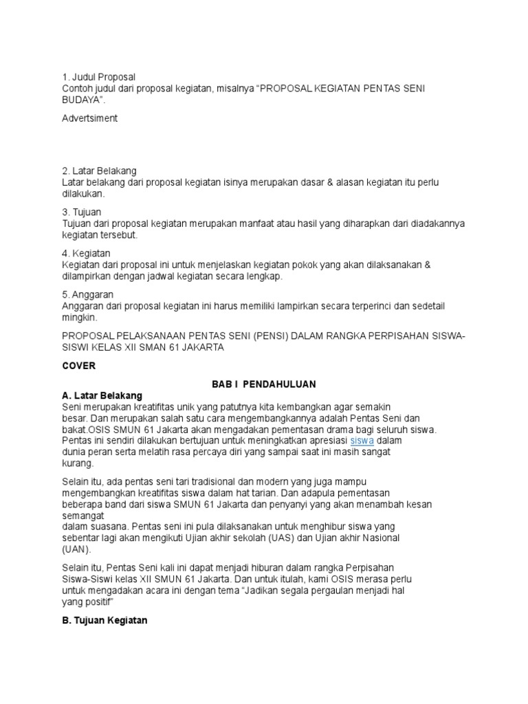 Rencana tersebut harus dituliskan agar pihak yang berkepentingan dapat memahami dengan baik. Download contoh proposal kegiatan. Contoh proposal yang paling sering dibuat tidak hanya dalam kalangan organisasi tetapi dilingkungan sekolah juga sering membuat proposal untuk kegiatan dalam lingkup sekolah seperti proposal kegiatan pentas seni pensi. Contoh proposal kegiatan untuk kelas xi mipa. Tentunya unsur proposal ini tidak kaku harus dimiliki karena hal ini tergantung dari jenis proposal dan rincian kegiatan yang akan dilaksanakan. Contoh proposal kegiatan proposal adalah rencana kegiatan yang dituliskan dalam bentuk rancangan kerja yang akan dilaksanakan.