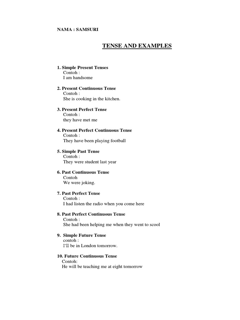 Nah jika kamu merasa masih bingung dengan past perfect tense berikut ini saya berikan 50 contoh kalimat past perfect tense beserta artinya. Tense ini digunakan untuk menyatakan sebuah kegiatan keadaan yang sudah terjadi sebelum kegiatan lain terjadi atau waktu tertentu di masa lalu. Contoh kalimat past perfect tense past perfect termasuk dalam salah satu bentuk kalimat lampau. Namun by the time harus selalu didahului kalimat past perfect tense. Twice before getting married dua kali sebelum menikah two times before they got married dua kali sebelum. Contoh kalimat present perfect tense beserta artinya present perfect tense merupakan tense yang dalam urutan penyampaiannya biasanya dijelaskan setelah present continuouskalian harus benar benar memahami tenses ini karena present perfect merupakan salah satu tenses yang sering digunakan terutama dalam percakapan sehari hari.