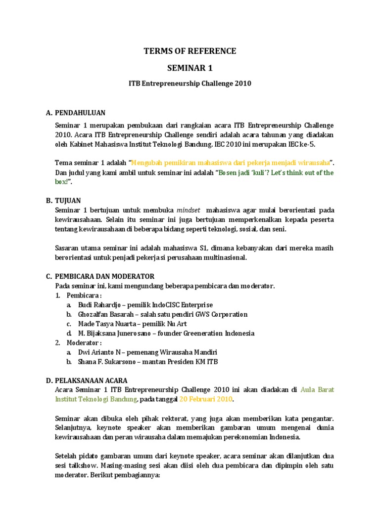 Latihan kader 1 gabungan. Istilah term of reference tor mungkin bisa dibilang asing bagi kitanamun jika mendengar kerangka acuan kerja kak lebih familiar bukan. Demikianlah term of reference tentang kegiatan seminar nasional dan call for papers pendidikan pancasila dan kewarganegaraan ke 4 ini dibuat semoga dapat menjadi bahan pertimbangan sebagaimana mestinya. Kak sendiri merupakan terjemahan harfiah dari pengertian tor. Oke nggak usah banyak nanya aja kali ya kali ini saya mau share tentang pembuatan term of reference tor dimana tor ini adalah sebagai alat penjelas undangan bagi siapapun itu baik dari pembicara pemberi sambutan dan tamu undangan yang spesial agar tahu bagiamana sih gambaran acara nya. Generally these are the guidelines offered to someone when they asked to examine a specific topic and explain them what they must bargain or what they can overlook.